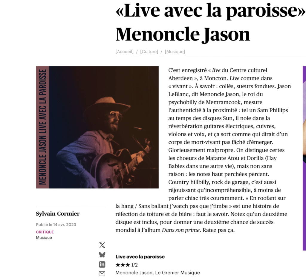 – L’Acadie Nouvelle – Menoncle Jason fait La grosse piastre avec son nouveau disque (9 décembre 2019)